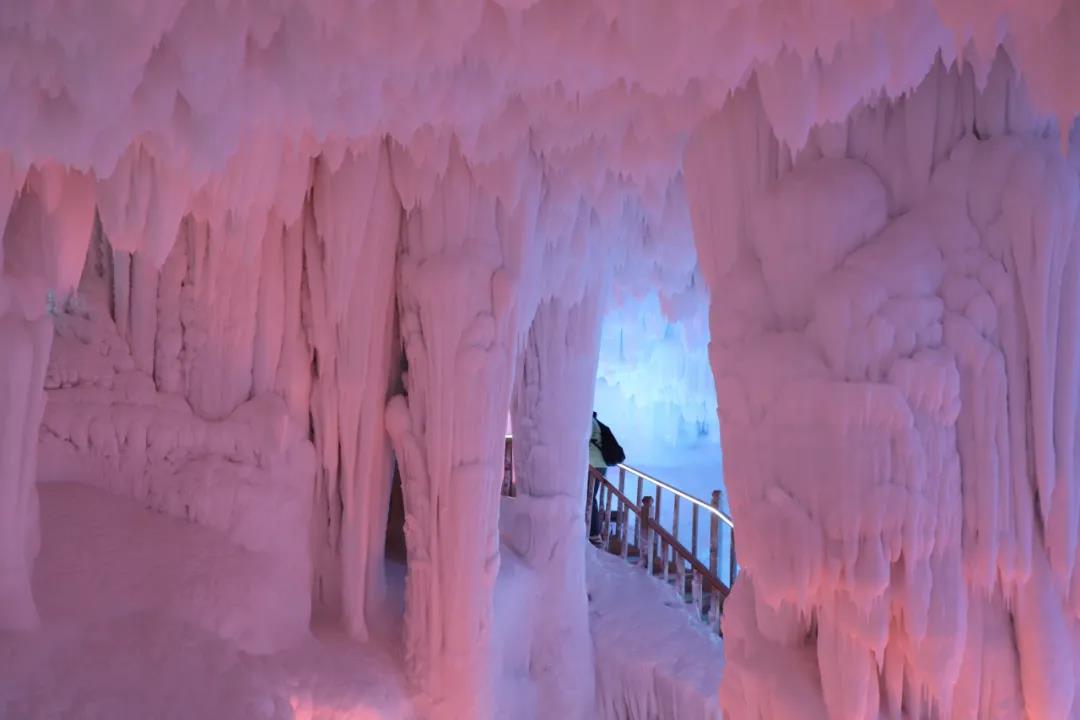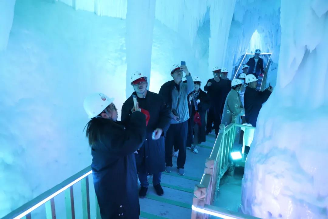 过了桥,大家稍做休息,进入了万年冰洞群,洞内晶莹剔透,寒气逼人。据专家考证,云丘山冰洞形成于第四季冰川期,距今已有300多万年,它的规模在世界范围内都是极为罕见的自然景观。大家看着冰洞内诸多的冰笋、冰柱、冰锥、冰葡萄,不禁赞叹冰洞景色美轮美奂,犹如仙境。