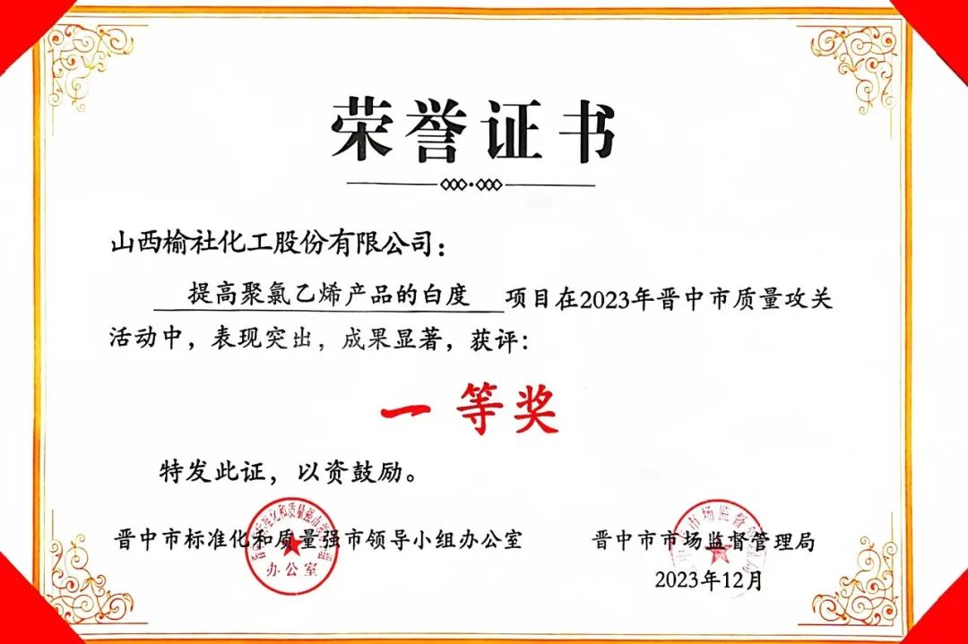 12月28日,在晋中市市场监督管理局主办的2023年晋中市重点质量攻关成果会上,公司“提高聚氯乙烯产品的白度”项目获得2023年晋中市质量攻关一等奖荣誉。