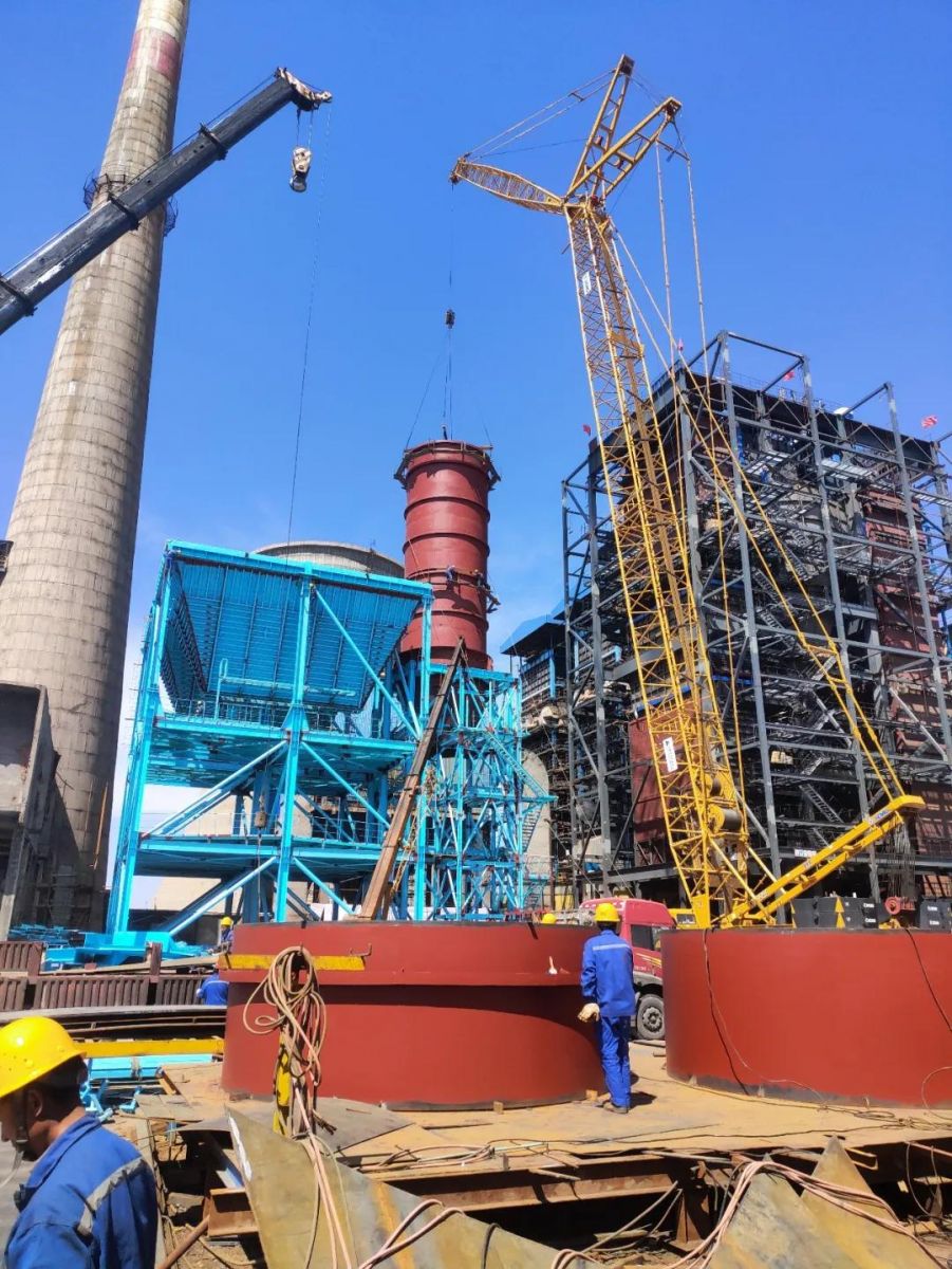 2#灰斗安装就位,吸收塔直筒最后筒体起吊组装。